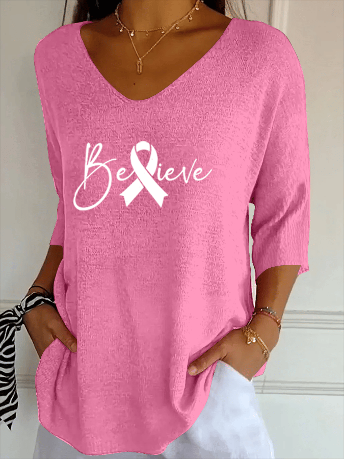 Women's Breast Cancer Believe Print Striped Fabric Casual V-Neck Shirt