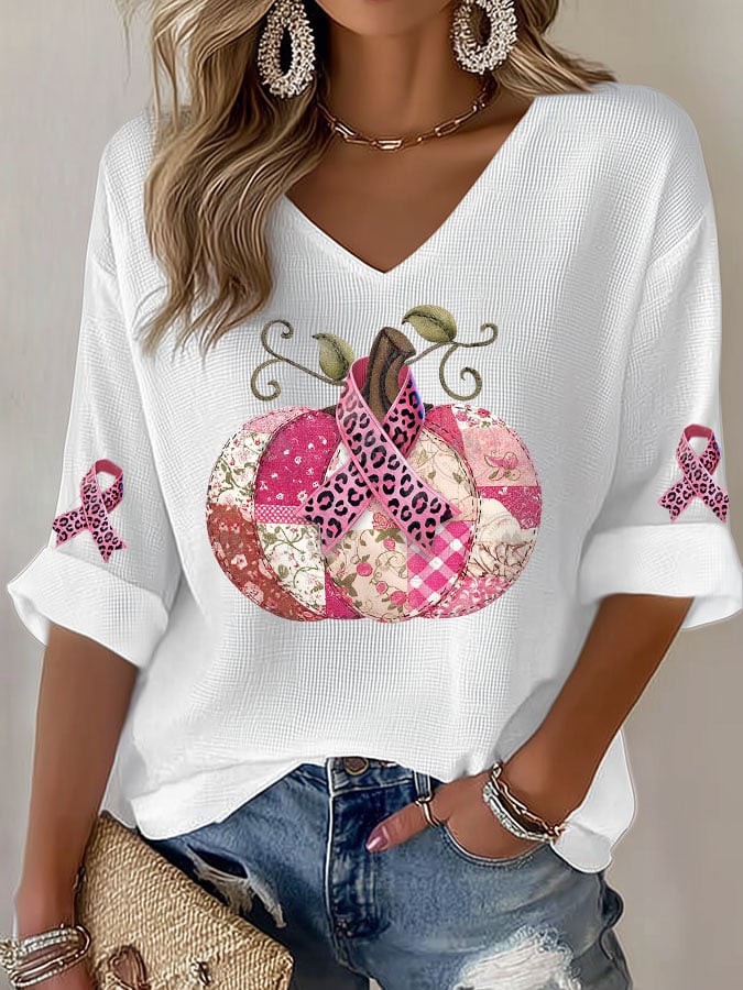 Women's Breast Cancer Pink Patchwork Pumpkin Print Waffle Shirt
