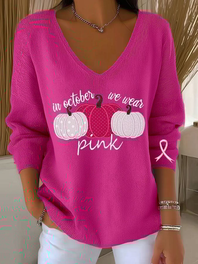 Women's Breast Cancer Pumpkin Print Casual Striped Fabric Long Sleeve Shirt